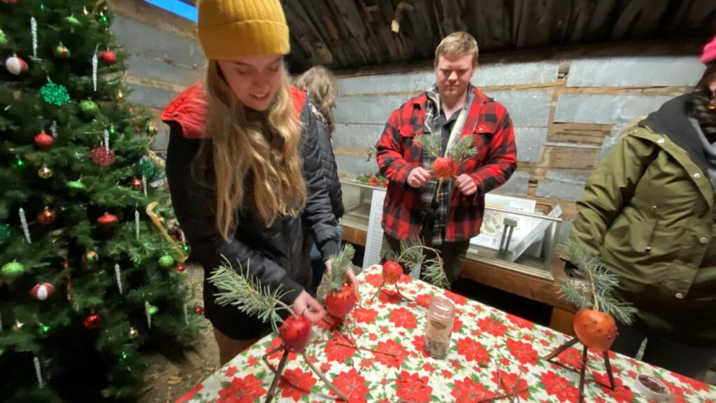 At the first cabin, visitors were taught about and created a Calennig. A Calennig is an apple balanced on three sticks to create a tripod and decorated with cloves, nuts, and evergreen branches. Once decorated, the apple is taken from house to house, and, like trick or treating, gifts and songs are exchanged with neighbors. The apple symbolizes good luck for the coming New Year.